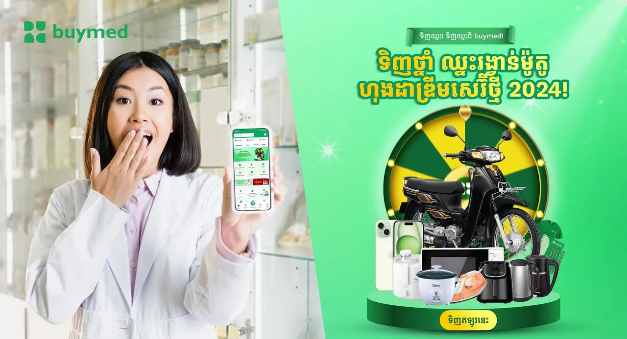 បាយមេដ (Buymed) គេហទំព័រលក់ថ្នាំពេទ្យបោះដុំធំជាងគេនៅកម្ពុជា មានសេចក្តីសោមន្សក្នុងការផ្តល់ជូននូវប្រូម៉ូសិនដ៏អស្ចារ្យ ថ្មីបំផុតរបស់ខ្លួន៖ "ទិញឈ្នះ! ទិញឈ្នះ! ទិញថ្នាំ ឈ្នះម៉ូតូហុងដាឌ្រីមសេរ៊ីថ្មី 2024!”