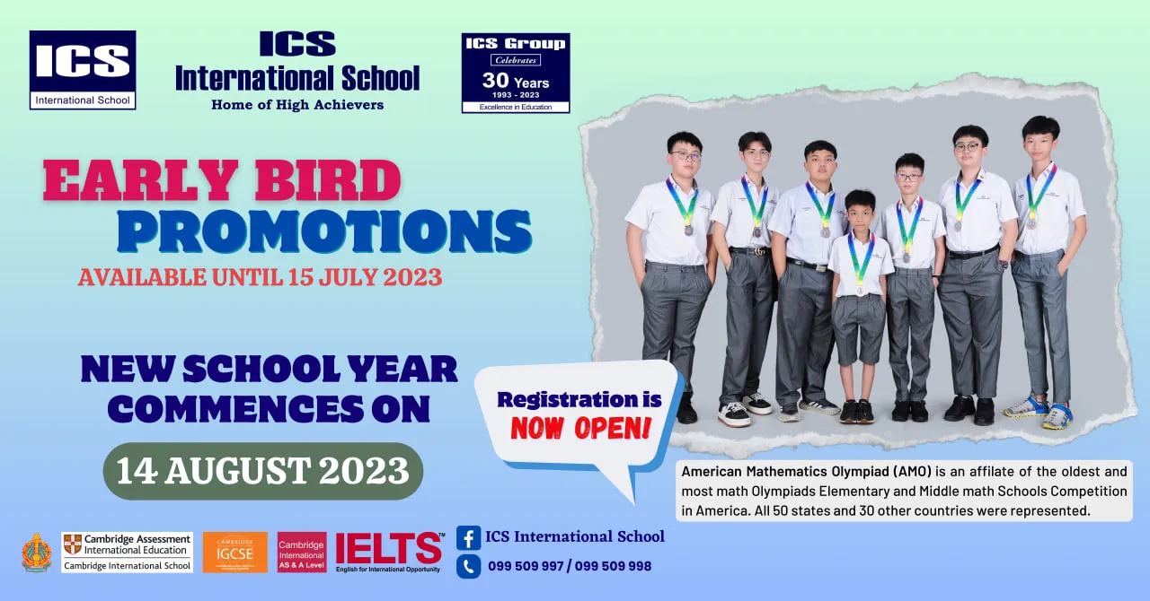 សាលាអន្តរជាតិ អាយ ស៊ី អេស នឹងចាប់ផ្តើមបើកបវេស្សនកាលឆ្នាំសិក្សាថ្មី 2023- 2024 នៅថ្ងៃចន្ទ ទី14 ខែសីហា ឆ្នាំ2023។ សាលាក៏មានការផ្តល់ជូនពិសេស (Early Bird Promotion) សម្រាប់ឆ្នាំសិក្សាថ្មី ចាប់ពីថ្ងៃផ្សាយដំណឹងនេះ រហូតដល់ថ្ងៃទី15 ខែកក្កដា ឆ្នាំ2023។
