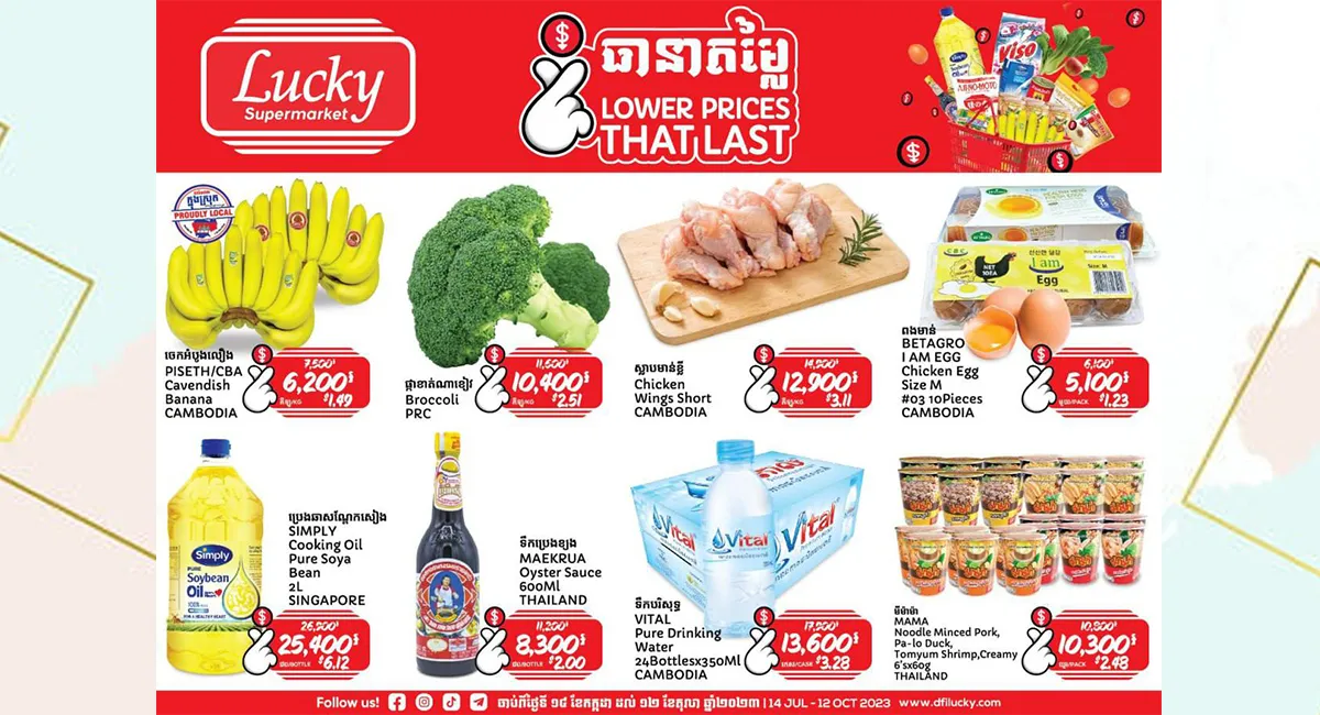 ប្រទេសកម្ពុជា, ថ្ងៃទី ១៤ ខែកក្កដា ឆ្នាំ២០២៣ - ផ្សារទំនើបឡាក់គី គឺជាផ្សារទំនើបលក់រាយឈានមុខគេ ក្នុងចំណោមផ្សារទំនើបជាច្រើន ដែលបានប្រកាសបើកកម្មវិធីពិសេសមិនធ្លាប់មានពីមុនមកគឺ “ធានាតម្លៃ ឬ LOWER PRICES THAT LAST” ដាក់លក់ទំនិញស្រស់និងគ្រឿងទេសដែលចាំបាច់សម្រាប់តម្រូវការប្រចាំថ្ងៃចំនួន ៦០ ប្រភេទ ក្នុងតម្លៃទាបជាងមុន ២០% មានរយៈពេលជិត ៣ ខែពេញ ចាប់ពីថ្ងៃទី១៤ ខែកក្កដា ឆ្នាំ២០២៣ រហូតដល់ថ្ងៃទី១២ ខែតុលា ឆ្នាំ២០២៣។
