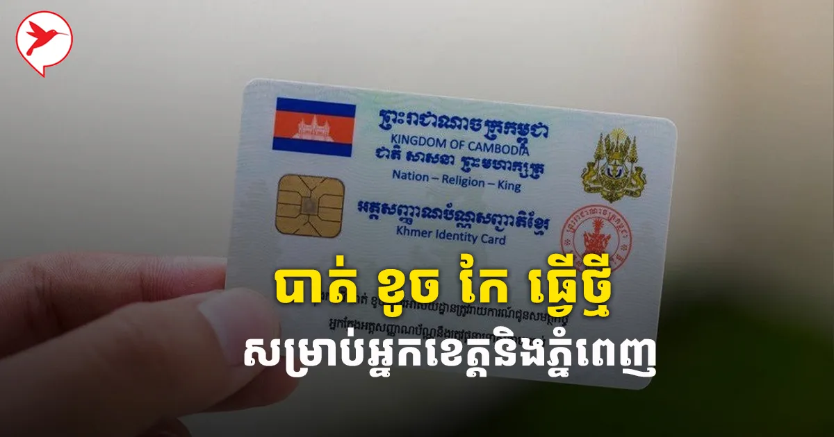 ជាដំណឹងល្អ សម្រាប់អ្នកដែលចង់ធ្វើអត្តសញ្ញាណប័ណ្ណថ្មី ឬបន្តសុពលភាព បាត់ ខូច និងកែតម្រូវ ឥឡូវនេះអាចធ្វើនៅរាជធានីភ្នំពេញបានហើយ។ នេះបើយោងតាមការបញ្ជាក់នៅលើហ្វេសប៊ុកផេករបស់ ឯកឧត្តម ឧត្តមសេនីយ៍ឯក សាយ ម៉េងឈាង អគ្គនាយករង នៃអគ្គនាយកដ្ឋានអត្តសញ្ញាណកម្ម កាលពីពេលថ្មីៗនេះ។