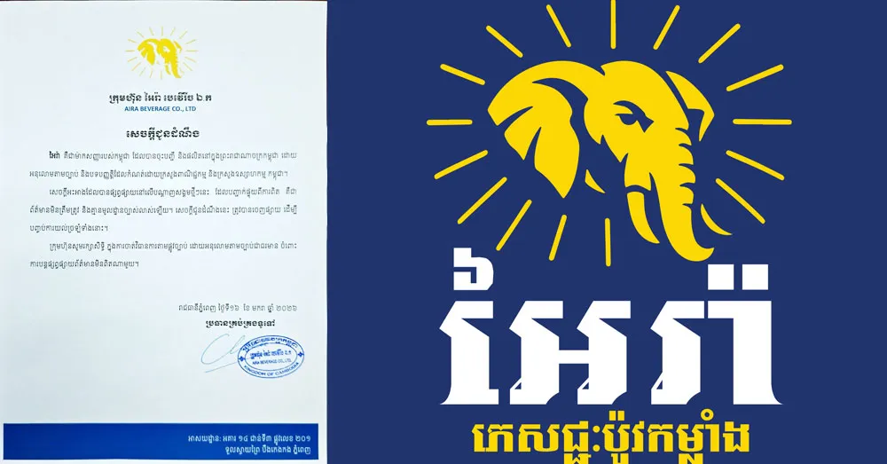 ក្រុមហ៊ុន អៃរ៉ា បេវើរីច ឯ.ក អះអាងថា អៃរ៉ា គឺជាម៉ាកសញ្ញារបស់កម្ពុជា ដែលបានចុះបញ្ជី និងផលិតនៅកម្ពុជា